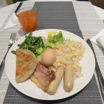 Завтрак проходит на первом этаже, с 06:30 до 10:00. Ассортимент обширный: свежие салаты, лапша, яйцо, бекон, сосиски, китайские пельмени, рис с овощами, несколько видов фруктов и десертов. Из напитков сок, чай, кофе, газированные напитки в банках. Для плотного завтрака достаточно.