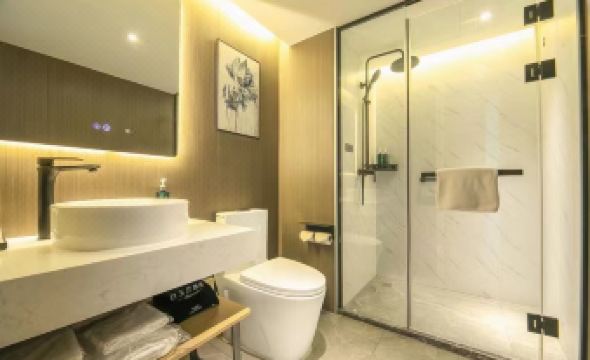 Удобное местоположение для посещения Юниверсал. Номер хороший, чистый. Большой минус стеклянная дверь в туалет с огромными зазорами по бокам. Это красиво смотрится, но доставляет дискомфорт если живет не семья, а друзья, например. Завтрак скромный, но за такую цену вполне себе. Думали отказать, однако просто кофе купить выходить в среднем 20 юаней. Отелем остались довольны
