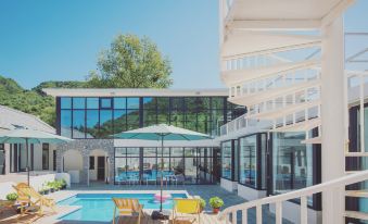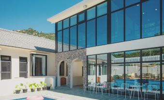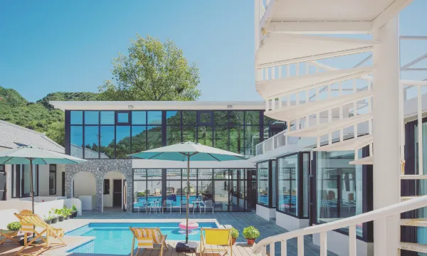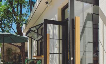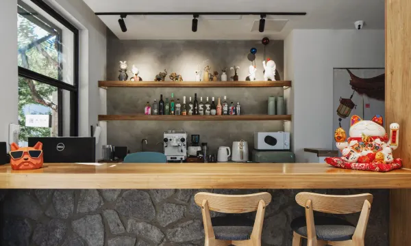 次日,我們漫步於旁邊山上的棧道,穿梭隧道,聽風戲水,盡情享受大自然的饋贈。歸來後,於民宿二樓,對着雄偉的長城,品上一杯沁爽的冰咖啡,方才靜下心來好好打量起這家民宿。“小晚”建築面積雖不大,老闆卻別具匠心,捨棄部分客房空間,精心打造出獨立湯池、影音室、露台會議室、小童設施、燒烤台與公共廚房。小院矮牆的佈置更是獨具巧思,並非簡單平直,而是巧妙結合湯池入口、進院入口與小院整體情調進行設計,每一處細節都彰顯着對提升客人體驗感的極致用心。