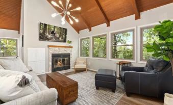 The home features beautiful wood ceilings on first and second floors. The back windows look out into the greenery of a wooded area. Perfect for enjoying morning coffee listening to the birds from the patio. You will feel like you are in a treehouse while still having the modern conveniences of indoor plumbing, electricity, heating and cooling!