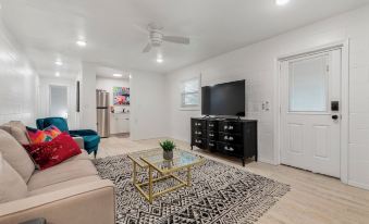 The inviting living room features a comfortable couch and a 50-inch smart TV, allowing you to log into your preferred streaming apps and enjoy your favorite shows.