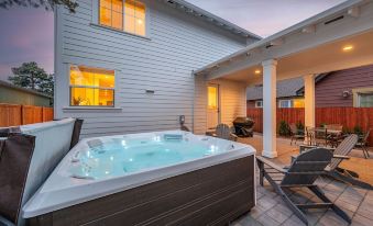 This quaint brand-new home built in 2022 is in the heart of Bends Southern Crossing district. You can walk or bike almost everywhere! This home was designed by award-winning local architect Muddy River Designs, with fabulous furnishings and modern amenities. This spacious four-bedroom, 2.5-bath sleeps up to 8 guests. The kitchen features stainless steel appliances. There is a gas fireplace to cozy up to after a day of adventures. The outside space includes a saltwater 7-person hot tub, Redwood Sauna, propane BBQ, and tables and chairs for socializing and dining.