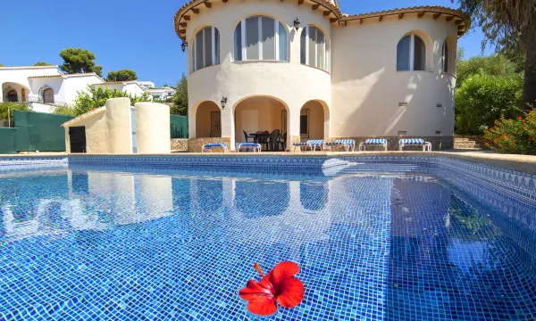 Fanadix 5 km from Moraira: Large villa "Oronella", 2 storeys. 5 km from the centre of Moraira, 9 km from the centre of Calpe, in the district Fanadix, in a sunny position residential area (villas), 850 m from the sea, 850 m from the beach, in a cul-de-sac. Private: property 670 m2 (fenced), swimming pool (8 x 4 m, seasonal availability: 01.Jan. - 31.Dec.) with internal staircase. Outdoor shower, garden furniture, pool maintenance by the owner/gardener. Heating available only from 01.Nov. - 30.Apr.. Grocery 1.9 km, supermarket 200 m, restaurant, café 600 m, bus stop 2.5 km, sandy beach "Playa La Fustera" 3.5 km (small), swimming bay 650 m. Sports harbour 4.5 km, marina 4.5 km, golf course (9 hole) 3.6 km, surf school 4.5 km, sailing school 4.5 km. Nearby attractions: Aqualandia, Mundomar, Terra Mítica, Terra Natura, Benidorm Palace (Benidorm), Les Fonts de l'Algar, Castillo de Guadalest. The owner does not accept any youth groups. "Oronella", 5-room house 162 m2 on 2 levels. Spacious and bright, comfortable and beautiful furnishings: living room with satellite TV, air conditioning and forced-air heating. Exit to the veranda. Dining room. 1 room with 1 french bed (160 cm, length 200 cm), air conditioning and forced-air heating. 1 room with 1 french bed (160 cm, length 200 cm). Open kitchen (4 hot plates, oven, dishwasher, toaster, kettle, microwave, freezer, electric coffee machine). Bath/WC, shower/WC. On the lower ground floor: (exterior staircase), 1 room with 1 french bed (1 x 160 cm, length 200 cm), shower/WC, air conditioning and forced-air heating. Exit to the patio, to the swimming pool. Terrace furniture, barbecue (portable), deck chairs (4). Facilities: washing machine, iron, children's high chair, baby cot for up to 2 year olds, hair dryer. Internet (WiFi, free). Parking (roofed, 1 car). Please note: one double bedroom is outside the apartment. Non-smoking house. No internal connecting door between the floors. VT-496572-A