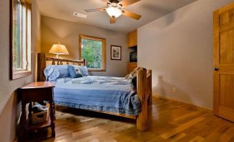 The spacious great room on the main level is all glass on three sides, with cathedral ceilings that give great views from every window. (The master bedroom/loft is just above the great room and enjoys these same great views!) There is a welcoming wood burning stove in the great room to take the edge off any chilly nights and two comfy leather couches with additional chairs for plenty of seating.