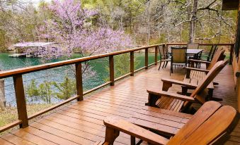 This cabin has easy access lake frontage on TWO sides! You can actually walk right out the lower-level doors to the two-tiered spacious deck, and down the deck steps and be right in the water. Enjoy swimming, fishing or simply relaxing on the water!