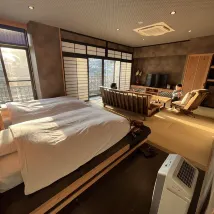 Номер был просторным. Очень порадовала возможность бесплатно взять юкату, а также бесплатные угощения и безлимитное пиво. Индивидуальные купальни под открытым небом (ротэнбуро) доступны по принципу «первый пришел — первый обслужен», но и ванная комната в номере была очень просторной и прекрасной. На крыше есть асия (ножная ванна), где было очень приятно расслабиться, потягивая алкогольные напитки.
