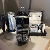 Номер очень чистый и хорошо оборудован кофеваркой и чайником.