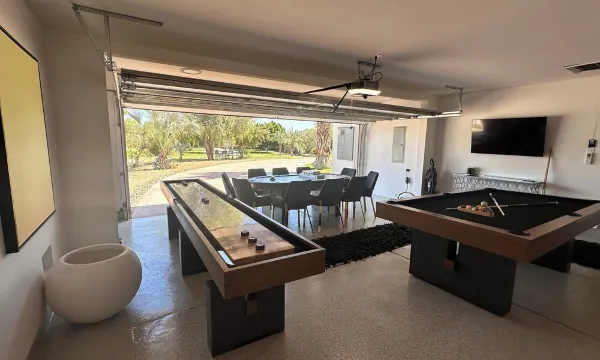 The estate is fully furnished with high-end furniture and fixtures, each bedroom has a flat screen Smart TV with free access to Netflix. High speed WiFi internet is provided throughout the property free of charge. Kitchen is equipped with high-end appliances including a Subzero refrigerator, Viking stove & oven, a state of the art steam microwave/convection oven, electric kettle, traditional drip coffee maker (ground beans), Keurig coffee maker, toaster, blender and a built-in beverage/wine refrigerator. Perhaps the best feature of the kitchen is its 12ft-long center island big enough to host a large dinner party. The living room features a giant see-through fireplace that separates the living room from the kitchen. There is also a large recreation room complete with a pool table, shuffleboard, a poker table and a sitting area with flat screen TV to keep the guests entertained and is large enough to host special events.