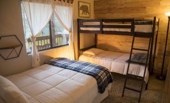 This 2 bed, 2 bath cabin comfortably sleeps 5-6 people with 1 queen, 1 full, and 1 twin bunk bed arrangement. It’s very well kept, maintained and cleaned with natural (non-chemical) products and essential oils. Linens, blankets, toiletries, fresh towels, laundry/dishwasher detergents, dryer sheets, and paper towels are included in each stay. The kitchen comes fully stocked with all the tools and amenities you would need to prepare meals (pots, pans, knife set, silverware, cooking/baking/bbq utensils, baking basics- hand mixer, mixing bowls, baking sheets/dishes-, toaster, Ninja blender, wine/bottle opener, etc.), and the living area has a cozy gas fireplace with ample room to sit around the fire, play games and enjoy the company of loved ones.