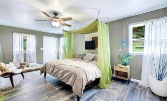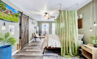 •Primary Suite 1: King bed with hanging sage sheer panels, closet, plush floor mattress, master bathroom, access to the deck, natural light & smart TV