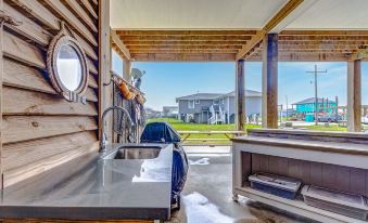 The downstairs entertainment area is designed to encourage great food with bar area, sink, and propane grill for your family chef to curate amazing food and drinks. There's also ample seating area downstairs with games for the whole family to enjoy - darts, hammock, horseshoe, box full of kid toys, and a kiddie pool for the little ones to stay cool. Rinse off after a full day at the beach with the outdoor shower.