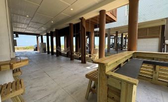 The highlight of this beachfront retreat is undoubtedly the outdoor oasis. Step outside to discover a spacious deck overlooking the ocean, complete with a sparkling pool, comfortable loungers, and a dining area ideal for al fresco meals and entertaining under the stars.