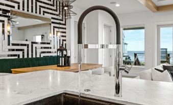 As you step inside, you'll be greeted by a light-filled living space adorned with elegant coastal decor and floor-to-ceiling windows showcasing panoramic views of the sparkling ocean. The living area features plush sofas and a flat-screen TV, perfect for relaxing after a day of sun-soaked adventures.