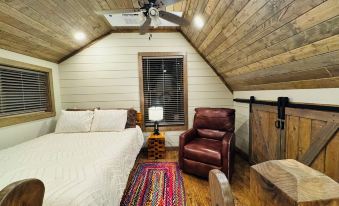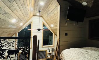 The Shack boasts 500 square feet of enchanting interior space. It features a cute kitchenette and a snug living room with a hideaway dining table. It has two cozy bedrooms with queen beds; one on the main floor and another via a loft-ladder! You’ll love the beautifully tiled bathroom with heated floors and a large walk-in shower, keeping you warm and comfortable even on cooler days.