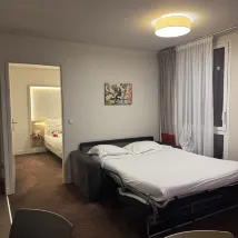 Мы сняли апартаменты с одной спальней на четверых. Просторный апарт-отель. Рекомендую, если вы путешествуете на машине, так как до города 15 минут езды. Есть парковка для высадки и посадки. Отличное соотношение цены и качества, плюс завтрак с булочками.
