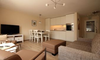 - a combined living and dining area (incl. TV + sofa bed for 2 more people.)