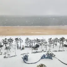 В тот день, когда мы пошли, выпало много снега, и было еще приятнее наблюдать уникальный пейзаж из снежных сугробов на пляже.