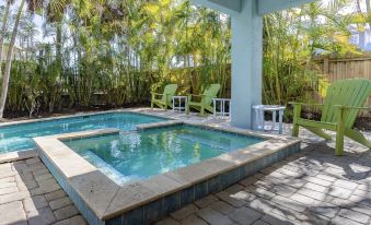 Step outside to the outdoor area, where you'll find a private heated pool and spa, a covered seating area with an outdoor dining table for 8 and a bar top for 2, a propane BBQ grill, a foosball table, and lush tropical landscaping. This space is perfect for unwinding and enjoying the Florida sunshine.