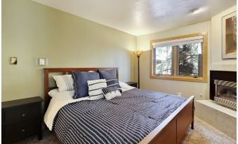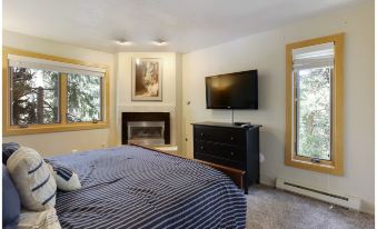 This 2 bedroom + loft, 2 bathroom condo can accommodate up to 8 guests. The primary bedroom has a king bed, a gas fireplace, and flat screen TV that is mounted. The second bedroom has a queen bed and a flat screen TV. Both of the bathrooms have a walk-in shower. There is no bathtub in the condo. The loft is located above the living room and has two twin beds and two full beds. The loft is minimally decorated and simplistic. It is outfitted with multiple beds for guests to sleep and very little else.