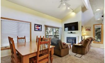 The kitchen and living room make up the rest of the living space in the condo. The kitchen is fully stocked with everything a chef needs to prepare a meal with plenty of counter top space and stainless steel appliances. The dining table has seating for 6 and is located just off of the living room. The living room is a great space for your group to relax with comfortable furniture, a gas fireplace, and a large flat screen TV. There is a small patio off of the living room with a gas grill and outdoor furniture. Also, there is a mudroom at the entrance of the condo that can be used to store all of your winter and summer gear.