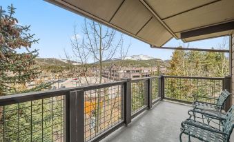 Relax in the open-concept living area, featuring high ceilings, elegant wide plank wood flooring, and abundant natural light. Step onto your private balcony to enjoy city views and fresh mountain air, or unwind beside the cozy gas fireplace after a day exploring Breckenridge.