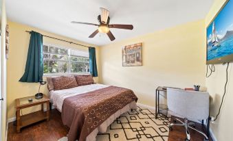 A cozy office-equipped bedroom offers additional quiet space away from the main living areas for guests in need of a focused place for remote work or study.