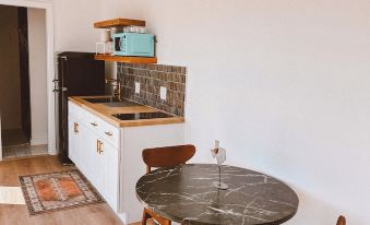 -Our countertop is a Butcher Block, and we do ask that you do NOT cut on it! Please do not set anything wet on it for an extended period! We do provide a cutting board!