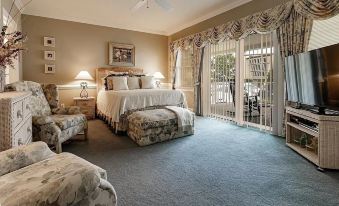 Spacious bedroom with a Queen size bed and attached bathroom with a large flat screen TV and sliding door to the porch for the morning coffee or afternoon siesta.