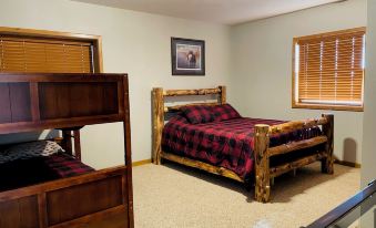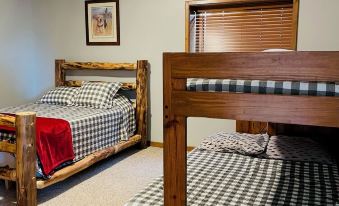 Our lodge is a beautiful 4 bedroom, 2.5 bathroom cabin with great amenities, scenic views, a front porch, back deck, and garage. The 4th bedroom is a loft area above the living room which has two futon couches that can turn into double beds.