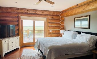 The main floor of the cabin is an open layout with a kitchen and living-dining space. Enjoy the master bedroom with a king bed and master bath with whirlpool tub.