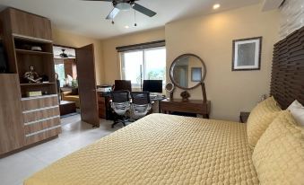 The apartment has one bedroom with a king-size bed, a 43” Smart TV, ceiling fan, air conditioning, large closet, and private full bathroom with rain shower. There is also a work desk with two monitors.