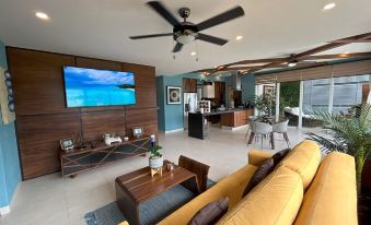 In the living room there is a comfortable sofa, a second 55” Smart TV, ceiling fan, air conditioning, a large dining room for 4 people, a second full bathroom for guests and a washer-dryer available for guests.