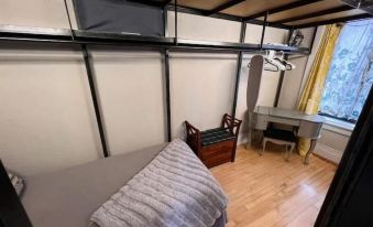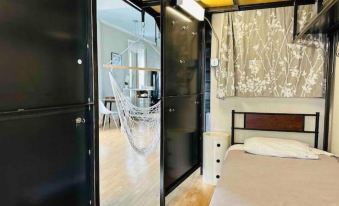 This light-filled loft features a stunning vaulted ceiling and a massive picture window overlooking the avenue. The king-size bed is so comfortable, guests often ask what brand it is. Below the sleeping loft is a dreamy walk-in closet with a single bed, and above it, a cozy futon accessible by ship deck stairs — ideal for couples but can comfortably host up to four guests.