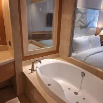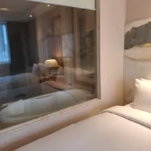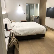 Хорошая транспортная доступность, прямо под отелем много кафе и ресторанов. Однако дизайн ванной комнаты довольно странный. Ванна и душевая зона расположены у окна с панорамным остеклением. Более того, унитаз отделен от остальной части санузла полностью прозрачным стеклом... Получается, если один человек принимает душ, другому придется выходить из номера, чтобы воспользоваться туалетом?