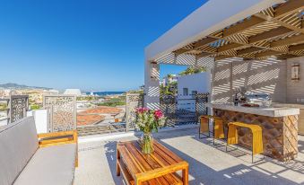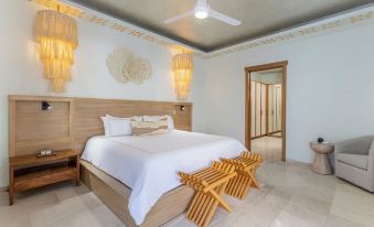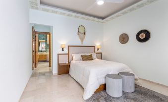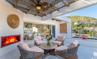 Fully stocked kitchen offers marble counters and stainless steel appliances, including dishwasher, any tools and gadgets that could possibly be needed for cooking. Or... bring in a local chef to do the cooking for you! The dining table seats 10-12 people and also can enjoy the terrace to enjoy meals. The master suite is furnished with a king size bed, closet, full bathroom ensuite. Step out from this bedroom to enjoy the terrace area. Second and third bedroom each have queen beds and share a full bathroom. Fourth bedroom has its own private bathroom attached. Enjoy the tranquility of the fountain and lazy river from the ground floor. The living area has a large Smart television (with international channels). Pocket doors allow an open space between kitchen, living area and outdoor terrace. In the evenings, relax in the oversized hot tub and by the fireplace. The upstairs terrace has an ocean view, BBQ, outdoor bar and outdoor couches.