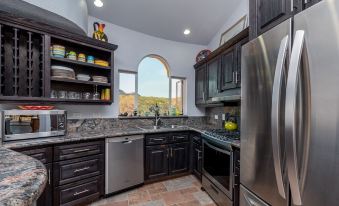 - two fully equipped kitchen with stainless steel appliances and granite countertops.