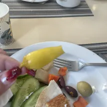 Ресторан в отеле неплохой, с хорошей обстановкой и разнообразием блюд. Сын считает, что он и так не очень привередлив в еде, поэтому он лучше меня. Что меня больше всего радует, так это то, что египтяне тоже любят есть квашеную капусту. В овощной салат добавляют много лимона. Он очень вкусный. [смеется] Самое душевное — это маленький маринованный перец. По вкусу он похож на наш. Вкус Хунань. Весь этот потенциал был полностью побеждён этим маринованным перцем! Ресторан очень внимательный и специально готовит кашу из белого риса для китайцев, что очень кстати!