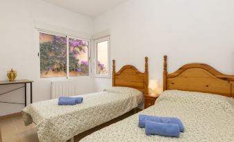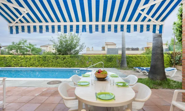 La Pìneda 1 km from Sant Antoni de Calonge: Apartment block "Rioja", 2 storeys. 450 m from the sea. Private: swimming pool angular (8 x 4 m, depth 30 - 220 cm, seasonal availability: 01.Jan. - 31.Dec.) with internal staircase. Outdoor shower, parking at the house. Supermarket 1 km, restaurant 700 m, bus stop 500 m, sandy beach "Sant Antoni de Calonge" 490 m. Sports harbour 4 km, golf course (18 hole) 9 km, riding stable 12 km. Nearby attractions: Parque Acuatico 12 km. Please note: no lift. The owner does not accept any groups. The owner does not accept any youth groups. Part of the house is closed and unoccupied. The owner lives on the same property. "Rioja", 5-room apartment 120 m2, on the ground floor. Living/dining room with open-hearth fireplace, digital TV, international TV channels, flat screen and air conditioning. Exit to the terrace, to the swimming pool. 2 rooms, each room with 2 beds (80 cm, length 180 cm). 1 room with 1 french bed (135 cm, length 190 cm), shower/WC. 1 room with 1 french bed (135 cm, length 190 cm). Kitchen (4 hot plates, toaster, kettle, microwave, freezer, electric coffee machine). Shower/bidet/WC. Gas heating. Small patio. Terrace furniture, deck chairs (4), covered balcony. View of the countryside. Facilities: washing machine, iron, children's high chair, hair dryer. Internet (WiFi, free). Parking at the house. Suitable for families. HUTG-073811