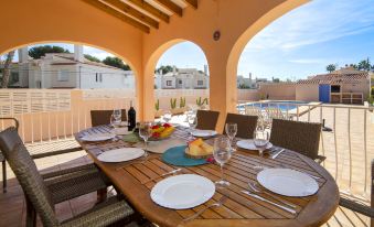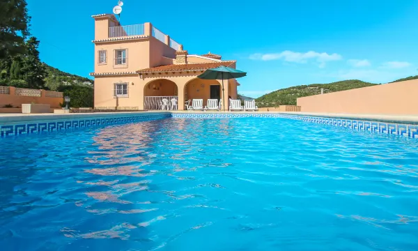 Villa "Enrique", 2 storeys. In the district of El Almendro 1.4 km from the centre of Calpe, residential area (villas), 1.8 km from the sea, 1.8 km from the beach. Private: property 815 m2 (fenced), swimming pool angular (8 x 4 m, seasonal availability: 01.Jan. - 31.Dec.). Outdoor shower, barbecue. In the house: roof terrace. Parking (for 4 cars) on the premises. Supermarket 1 km, bus stop 290 m, sandy beach "Playa El Arenal" 1.8 km. Nearby attractions: Parque atracciones Terra Mítica 35 km, Parque Acuático Aqualandia 25 km. Hiking paths: Parque natural Peñon de Ifach 4 km. "Enrique", 6-room house 190 m2 on 2 levels. Object suitable for 10 adults. Practical and cosy furnishings: living/sleeping room with 1 sleeping facility and open-hearth fireplace (only for decoration), satellite TV. Exit to the terrace. 2 rooms, each room with 2 beds (90 cm, length 190 cm), air conditioning and forced-air heating. 1 room with 2 beds (90 cm, length 190 cm), shower/WC, air conditioning and forced-air heating. Kitchen (oven, dishwasher, 4 ceramic glass hob hotplates, toaster, kettle, microwave, freezer, electric coffee machine) with dining table. Shower/WC. Upper floor: 1 room with 1 french bed (150 cm, length 190 cm), shower/WC, air conditioning and forced-air heating. 1 room with 1 french bed (150 cm, length 190 cm), shower/WC, air conditioning and forced-air heating. Exit to the terrace. Terrace roofed. Terrace furniture, barbecue, deck chairs (5), covered balcony, sitting area. Facilities: washing machine, iron, children's high chair, baby cot for up to 2 year olds, hair dryer. Internet (WiFi, free). Parking (fenced 4 cars). Suitable for families. Maximum 2 pets/ dogs allowed. AT-438355-A // Reg. Nr.: ESFCTU00000302900027813100000000000000000AT-438355-A2