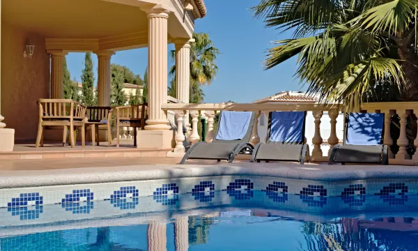 Villa "Calpetenis". 3.6 km from the centre of Calpe, 25 km from the centre of Benidorm, 60 km from the centre of Alicante, 1 km from the sea, 1.8 km from the beach. Private: property 964 m2 (fenced), garden (fenced), swimming pool angular (10 x 4 m, depth 150 - 220 cm, seasonal availability: 01.Jan. - 31.Dec.). Tennis, garden furniture, barbecue, parking on the premises. Supermarket 1.2 km, restaurant 800 m, bus stop 700 m, sandy beach "La Fossa" 1.8 km. Nearby attractions: Aqualandia 25 km, Terra Mitica 35 km, Aeropuerto El Altet Alicante-Elche 75 km. Hiking paths: Peñon de Ifach 3 km. The owner does not accept any youth groups. "Calpetenis", 5-room villa 311 m2 on 2 levels. Living/dining room with dining table, satellite TV, international TV channels, air conditioning and forced-air heating. Exit to the terrace. 1 room with 1 french bed (135 cm, length 190 cm), bath/bidet/WC, air conditioning and forced-air heating. Open kitchen (oven, dishwasher, 4 ceramic glass hob hotplates, toaster, kettle, microwave, freezer, electric coffee machine). Sep. WC. Upper floor: 1 room with 1 french bed (150 cm, length 190 cm), shower/WC, air conditioning and forced-air heating. Exit to the balcony. 2 rooms, each room with 2 beds (90 cm, length 190 cm), air conditioning and forced-air heating. Exit to the balcony. 1 room with 2 beds (90 cm, length 190 cm), air conditioning and forced-air heating. Exit to the terrace. Shower/WC. Patio. Terrace furniture, barbecue, deck chairs. View of the swimming pool. Facilities: washing machine, iron, children's high chair, baby cot for up to 2 year olds. Internet (WiFi, free). Parking. Maximum 1 pet/ dog allowed. AT-456320-A ESFCTU00000302900027789900000000000000000AT-456320-A6
