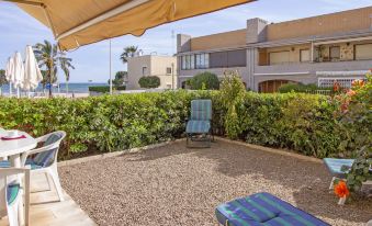 La Llosa 1 km from Cambrils: Cosy, comfortable apartment block "Golf de Sant Jordi". In a central, sunny position, 30 m from the sea, 30 m from the beach, in a cul-de-sac. For shared use: large garden, swimming pool (depth 120 - 200 cm, seasonal availability: 01.Jun. - 15.Sep. pool opening hours: 09:00-22:00). Outdoor shower. Bus stop "orquidies 36" 300 m. Nearby attractions: Port Aventura / Ferrari Land, Jumpland, Acuopolis. Hiking paths: La Mussara. Please note: baby equipment on request (extra). "Golf Sant Jordi", 3-room apartment 51 m2, on the ground floor. Practical and cosy furnishings: living/dining room with 1 sofabed, digital TV, air conditioning and forced-air heating. Exit to the terrace. 1 room with 1 french bed (150 cm, length 190 cm). 1 room with 2 beds (90 cm, length 190 cm). Open kitchen (oven, 3 ceramic glass hob hotplates, toaster, kettle, microwave, electric coffee machine). Bath/WC. No heating option. Terrace. Terrace furniture, deck chairs. Side view of the sea. Facilities: washing machine, iron, hair dryer. Please note: non-smokers only. HUTT044435