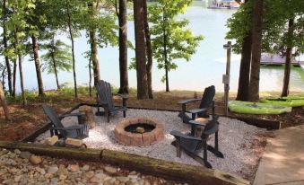 **Outdoor Fun:** A flat area by the water has been designed for recreational activities, such as cornhole. We also offer a water slide and kayaks for your enjoyment.