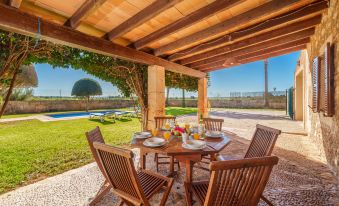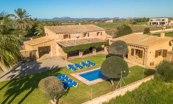 Campos 5 km from Es Trenc: Beautiful, cosy, simple farmhouse "Es Palmer des Trenc", 2 storeys. Property composed of main house and outbuilding, 6 km from the sea, 6 km from the beach. Private: garden with lawn, swimming pool angular (3 x 7 m, seasonal availability: 01.Mar. - 31.Oct.). Patio, pergola, garden furniture, barbecue, pool maintenance by the owner/gardener. In the house: washing machine. Parking at the house. Grocery 8 km, supermarket 8 km, shopping centre 8 km, restaurant 6 km, bar 6 km, bakery 8 km, bus stop "Campos" 8 km, sandy beach "Ses Covetes" 6 km. Marina 8 km, golf course (18 hole) 16 km. Nearby attractions: Ses Covetes 8 km, Campos 8 km, Santanyi 14 km, Ses Salines 6 km. Please note: car recommended. Suitable for families, baby equipment (included). Object suitable for 8 adults. The owner does not accept any youth groups. Loading and unloading of baggage is possible at the holiday house. Airfield 39 km from the property. "Es Palmer des Trenc", 5-room farmhouse. Object suitable for 8 adults. Spacious and bright, simple and rustic furnishings: 1 double bedroom with 1 french bed (1 x 150 cm, length 200 cm), air conditioning and forced-air heating. Living room with kitchen corner, bar and satellite TV. Kitchen-/living room (4 hot plates, oven, dishwasher, toaster, kettle, microwave, electric coffee machine) with dining table and satellite TV. Bathroom, bath/WC. Air-conditioning, forced-air heating. Heating not available in all rooms. Upper floor: 2 double bedrooms, each room with 2 beds (90 cm, length 200 cm), air conditioning and forced-air heating. 1 double bedroom with 1 french bed (1 x 180 cm, length 200 cm), air conditioning and forced-air heating. Bath/WC. Air-conditioning, forced-air heating. Natural stone floors. Comfortable furnishings in the country house style. Patio, lawn. Terrace furniture, barbecue, deck chairs (8), sitting area. Panoramic view of the mountains. Facilities: washing machine, iron, children's high chair, baby cot for up to 2 year olds, hair dryer. Internet (WiFi, free). Parking at the house. Suitable for families. ETV/404