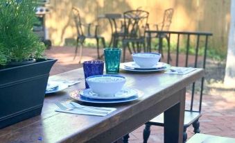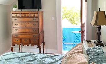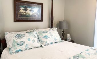 The Captain’s Cottage is a historic cassat cottage consisting of four bedrooms and two full baths. There are six beds to comfortably sleep up to nine guests total. The Mermaid bedroom has a queen-size bed; the Seahorse bedroom has a full-size bed; the Nautical bedroom has a twin-size bed and a twin-day bed trundle; the Captain’s Quarters bedroom has a king-size bed as well as its own private balcony. Each bedroom also has its own TV available for streaming and ample bedroom storage during your stay. There is a full bathroom on each floor. The downstairs bathroom features a relaxing soaking tub and a double-headed shower. The upstairs bathroom has a standing shower and a brand new single vanity with storage. Towels, shower essentials, and a hairdryer will be provided during your stay.
