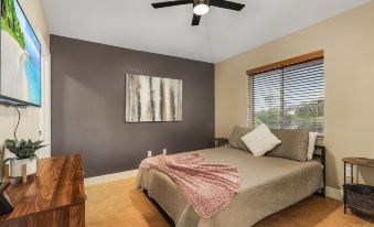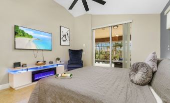 The master bedroom boasts a luxury king size memory foam bed with views of the pool and canal out the glass patio doors. If the views weren’t amazing enough, the room also has a smart TV and fireplace. The connecting master bath has a custom tiled walk through shower, jetted jacuzzi tub, two vanities and large closet.