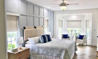 The King Suite bedroom become an oasis, adorned with a sumptuous king bed and a cozy window seating area for two to enjoy good book. The master bathroom is a work of art, elevating your stay with a touch of sophistication.