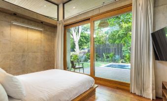A spacious and open fully equipped kitchen and living room area that seamlessly blends indoor and outdoor living with floor-to-ceiling windows.