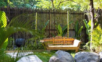 Outside, you’ll discover your own private oasis, featuring a big swimming pool surrounded by green gardens. Lounge on the sun-kissed terrace, take a refreshing dip in the pool, or simply hang out and enjoy the tropical vibes.