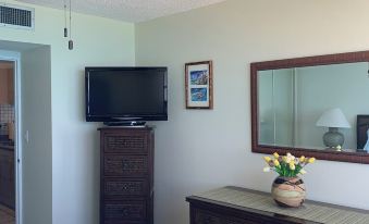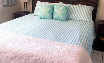 cozy one bedroom has a king size bed, a living room with a full couch and a recliner for you to lean back and listen to the ocean waves with an spectacular view All comfy furniture!!!!! 2 flat screen TVs / DVD with 250 high speed wireless internet, central air conditioning, new stainless steel outdoor furniture. Also includes outside playground for children and BBQ area for friends and family.