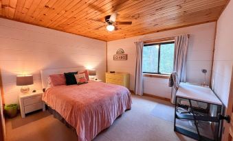 Main Floor: The open concept main floor has a family room with tv and gas fireplace, dining table for 8, and an upscale kitchen with a farmhouse sink, gas stove/oven, refrigerator, microwave/convection oven, trash compactor, wine chiller and a large island with seating for 4. It is well stocked with all of the necessary cookware, appliances and accessories needed to make your meals. The bedroom/bathroom en-suite located on the main floor is perfect for anyone who has trouble navigating stairs. It has a king bed with 6 drawer storage underneath, a desk and a tv. In the bathroom there is a dual vanity, a separate toilet room, a large walk in shower with dual shower heads, and a full size front load washer and dryer.